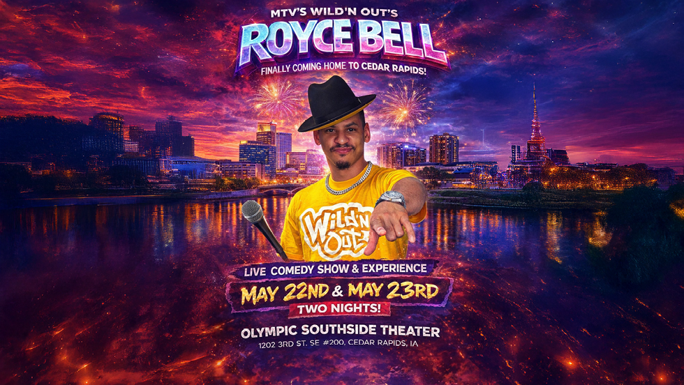 Born in Cedar Rapids and sharpened on stages far from it, Royce Bell returns for a two-night victory lap at The Olympic Theater, May 22 through May 23. This is not just another date on the calendar. This is a full-circle moment with a mic in hand and something to prove.